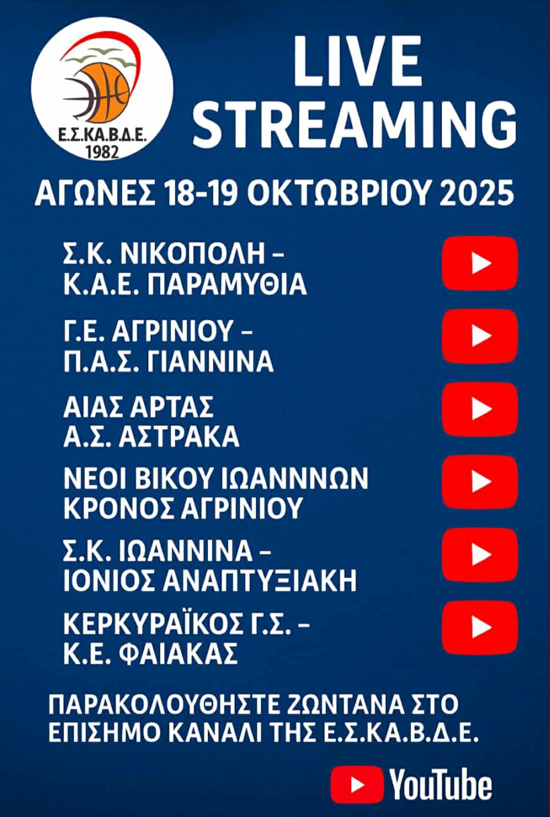 Πλούσιο μπασκετικό θέαμα στην Α1 Ανδρών Ε.Σ.ΚΑ.Β.Δ.Ε.! Το Σαββατοκύριακο 18 & 19 Οκτωβρίου 2025 η δράση κορυφώνεται στα παρκέ της Α1 Ανδρών με συναρπαστικές αναμετρήσεις, οι οποίες θα καλυφθούν ζωντανά μέσω live streaming στο YouTube! Μείνετε συντονισμένοι και παρακολουθήστε τους αγώνες της αγαπημένης σας ομάδας: Σ.Κ. Νικόπολη – Κ.Α.Ε. Παραμυθιά 18/10 (17:00) https://youtube.com/live/efJslcXkNFY Γ.Ε. Αγρινίου…
